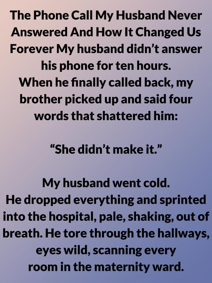 My husband didn’t answer his phone for ten hours, and those hours carved something raw into both of us. When he finally returned the call, my brother’s voice met him with four brutal, unfinished words: She didn’t make it. Those words hollowed him out instantly. He imagined the worst — imagined me gone, imagined our child born without a mother, imagined every stubborn silence between us becoming the last thing we ever shared. He ran into the hospital like a man being chased by death itself, tearing through hallways, breathless, frantic, already grieving something he thought he couldn’t undo. He didn’t hear the rest of my brother’s sentence — that I hadn’t made it home because I had been admitted. He only heard the part that sounded like goodbye.